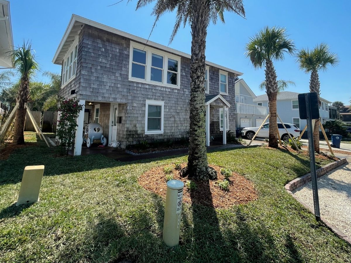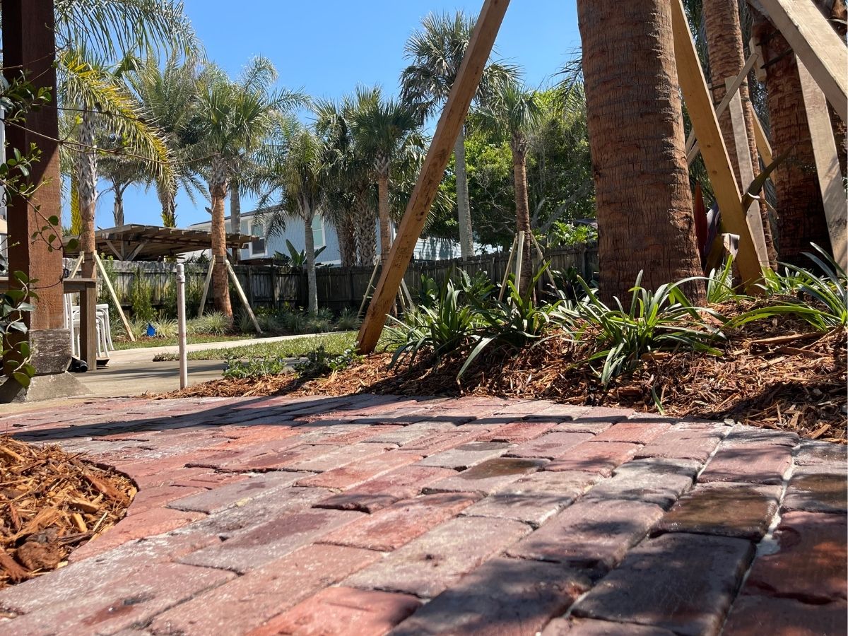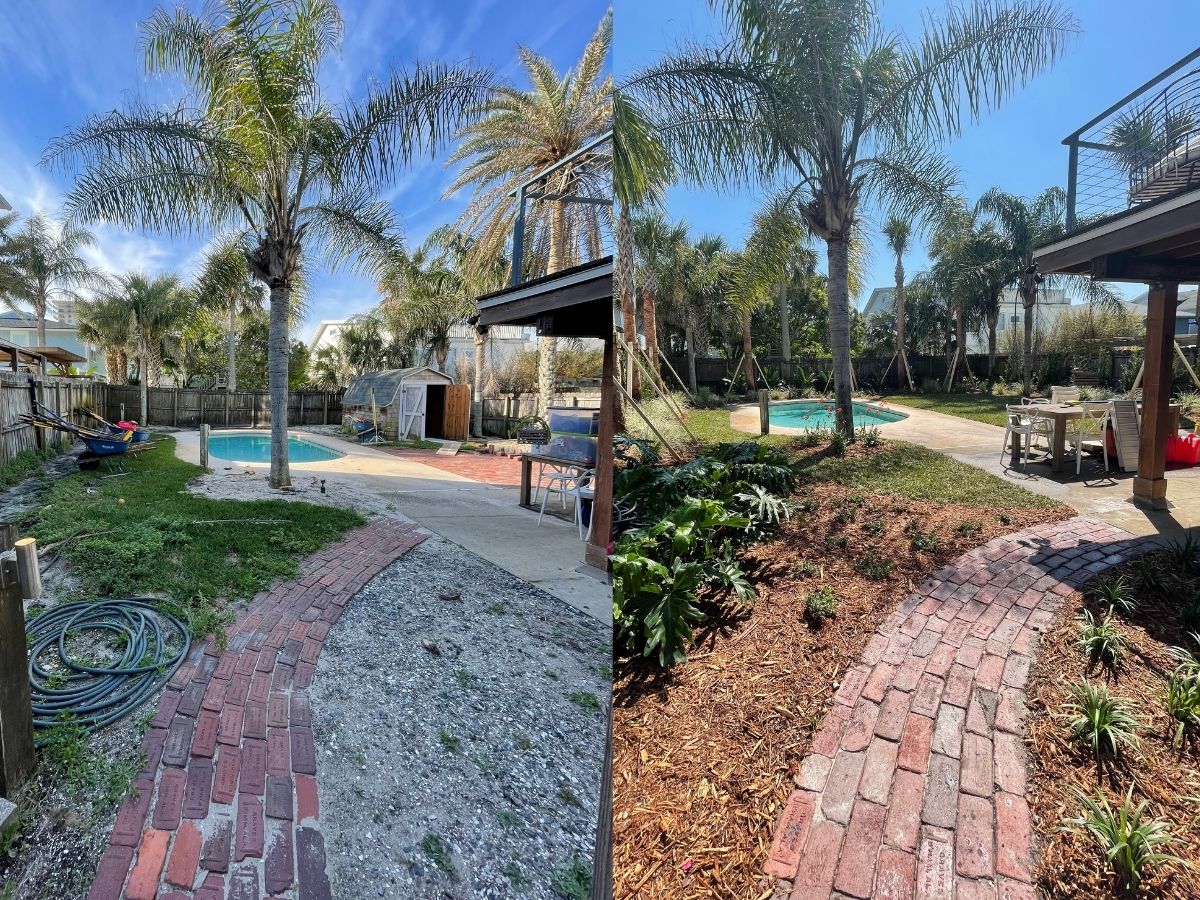 We installed large, beautiful Sabal palms around the entire property, paired with low-maintenance plantings that brought the yard to life. The front yard was modified to accommodate an additional parking space using crushed shell and a brick retaining wall designed to match the walkways.