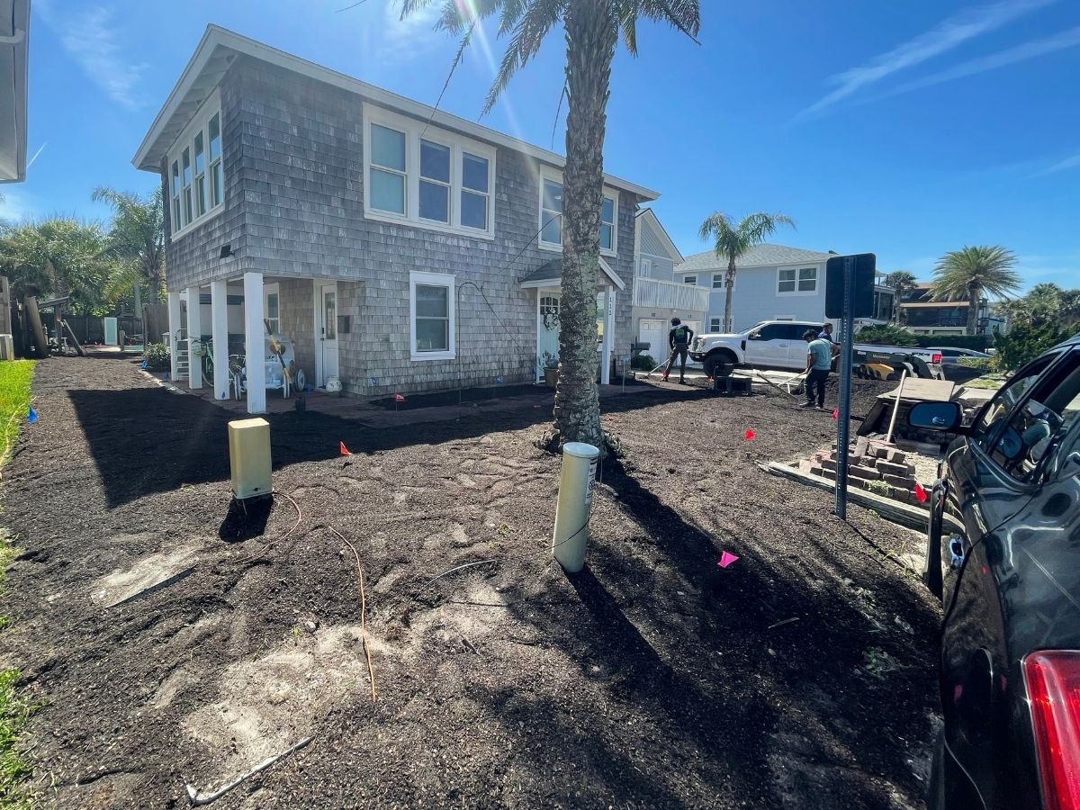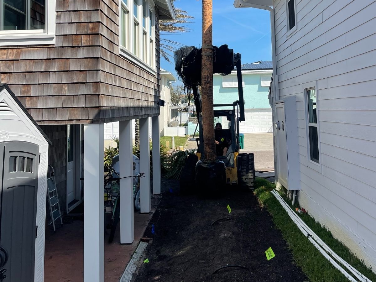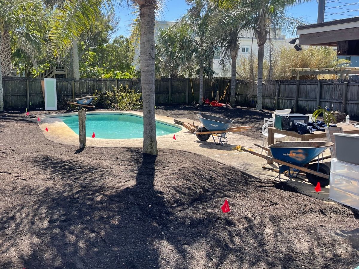 This was a fun and challenging full landscape overhaul. The project began with removing all existing grass and plant material, along with a shed, a large Sylvester palm, and existing brick walkways (which were reinstalled at the end). This allowed equipment access to the backyard.